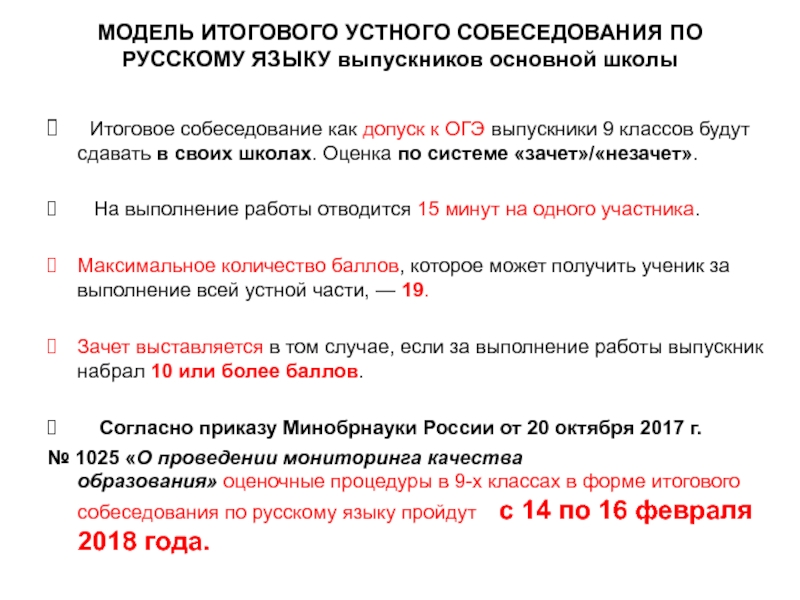 № 1025 «О проведении мониторинга качества образования» оценочные процедуры в 9-х классах в форме итогового собеседования по русскому языку пройдут с 14 по 16 февраля 2018 года.