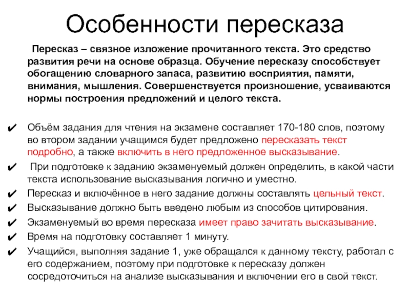 Объём задания для чтения на экзамене составляет 170-180 слов, поэтому во втором задании учащимся будет предложено пересказать текст подробно, а также включить в него предложенное высказывание.