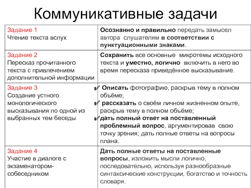 контролируются навыки техники осмысленного чтения: проверяется понимание экзаменуемым содержание читаемого, которое проявляется в оформлении фонетической стороны устной речи, темпе чтения, соответствии интонации знакам препинания текста (паузация, словесное ударение, повышение-понижение громкости голоса), соблюдении орфоэпических и грамматических норм, отсутствии искажений слов;
