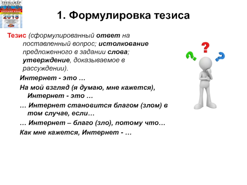 Тезис (сформулированный ответ на поставленный вопрос; истолкование предложенного