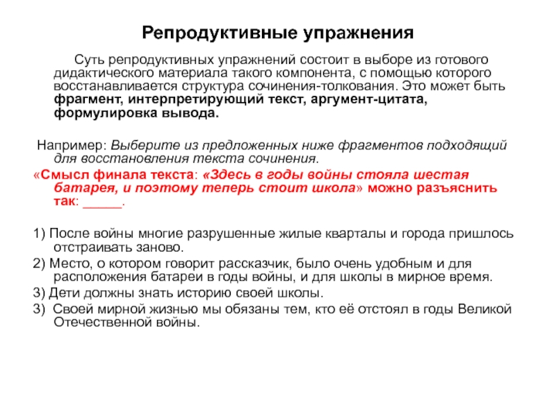 репродуктивных упражнений состоит в выборе из готового дидактического материала такого