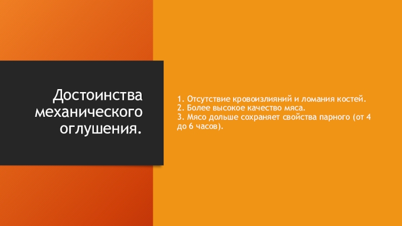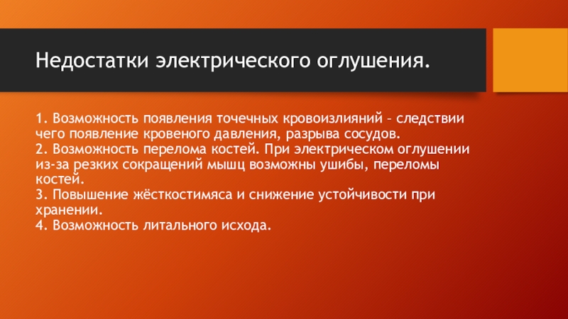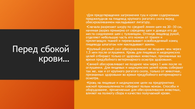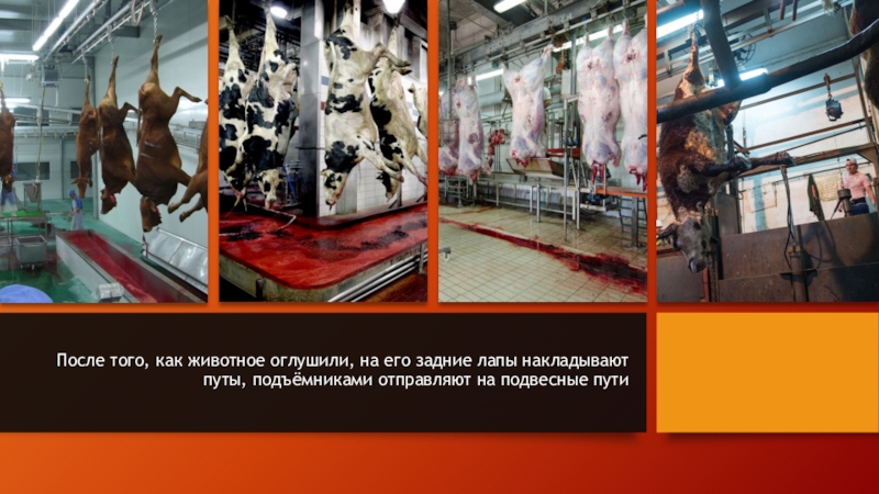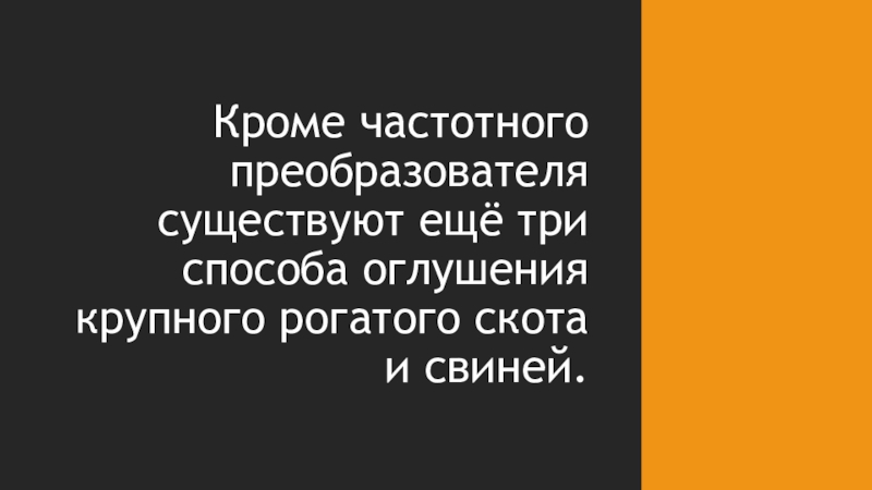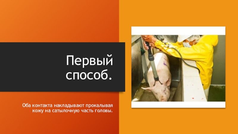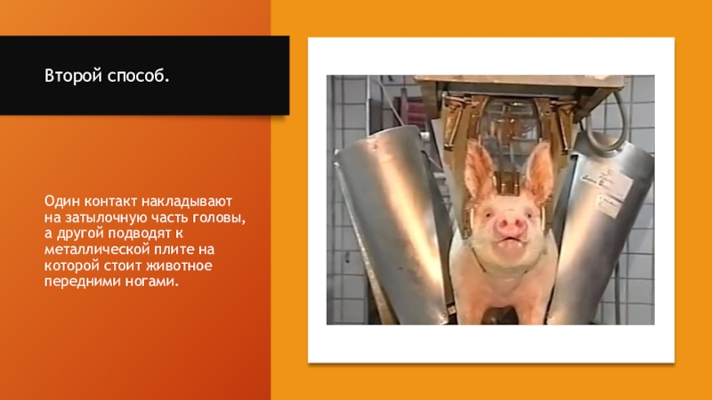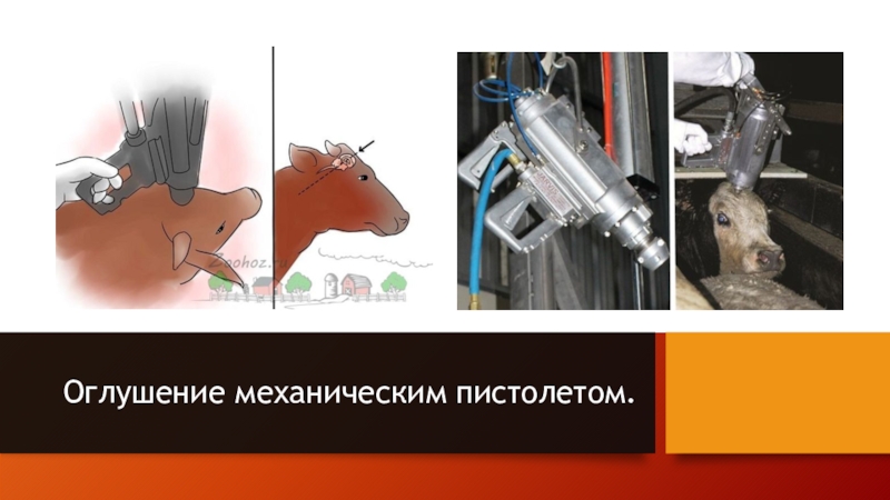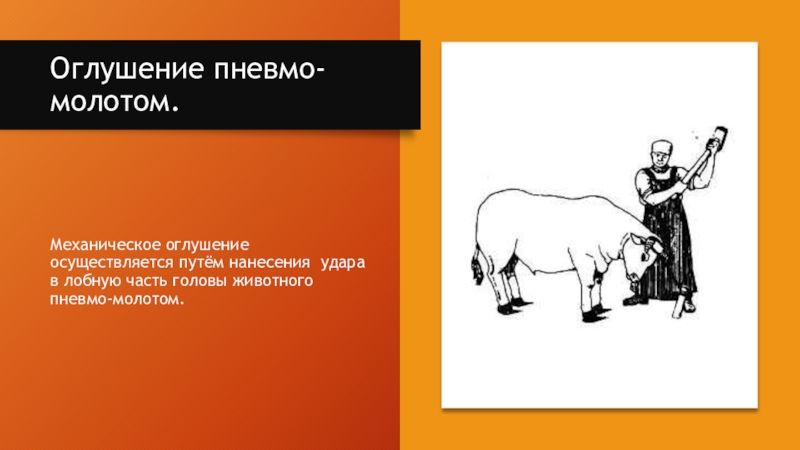 Оглушают только крупный рогатый скот и свиней.Существует несколько способов оглушения: поражение нервной системы электрическим током, поражение головного мозга механическим воздействием, анастезирование диоксидом углерода или другими химическими веществами.