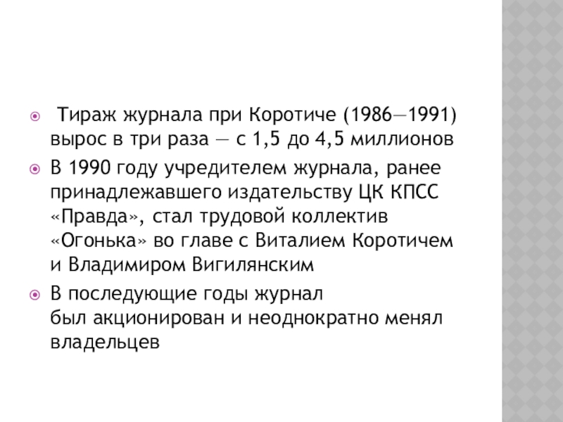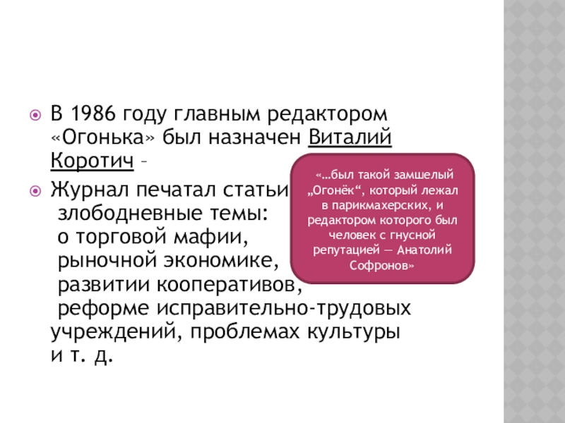 «…был такой замшелый „Огонёк“, который лежал в парикмахерских, и редактором которого был человек с гнусной репутацией — Анатолий Софронов»