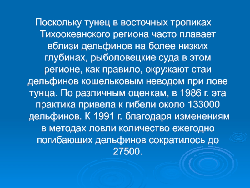 Слайд 3Поскольку тунец в восточных тропиках Тихоокеанского региона часто плавает вблизи