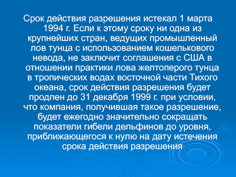 тунца с использованием кошелькового невода, не заключит соглашения с США в отношении практики лова желтоперого тунца в тропических водах восточной части Тихого океана, срок действия разрешения будет продлен до 31 декабря 1999 г. при условии, что компания, получившая такое разрешение, будет ежегодно значительно сокращать показатели гибели дельфинов до уровня, приближающегося к нулю на дату истечения срока действия разрешения