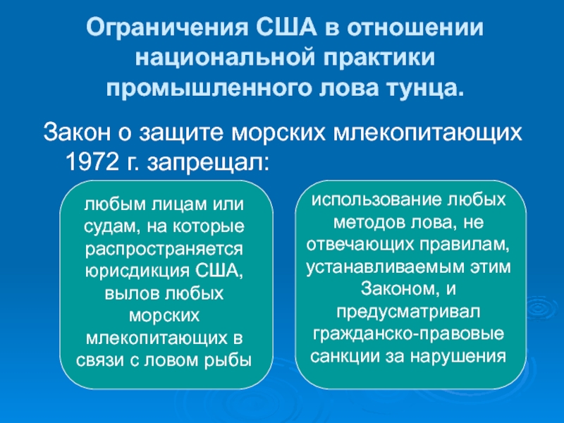 Слайд 4Ограничения США в отношении национальной практики промышленного лова тунца.