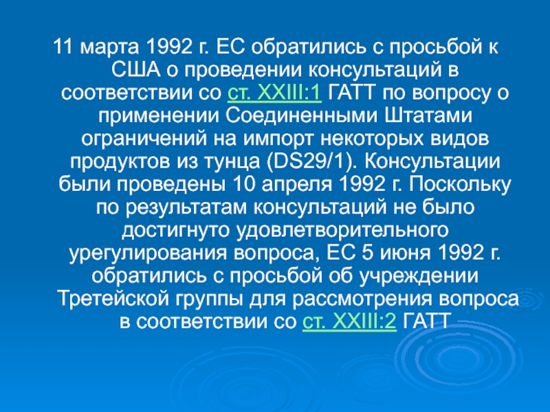 вопросу о применении Соединенными Штатами ограничений на импорт некоторых видов продуктов из тунца (DS29/1). Консультации были проведены 10 апреля 1992 г. Поскольку по результатам консультаций не было достигнуто удовлетворительного урегулирования вопроса, ЕС 5 июня 1992 г. обратились с просьбой об учреждении Третейской группы для рассмотрения вопроса в соответствии со ст. XXIII:2 ГАТТ