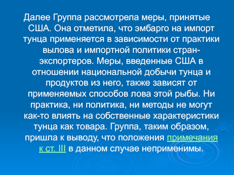 импортной политики стран-экспортеров. Меры, введенные США в отношении национальной добычи тунца и продуктов из него, также зависят от применяемых способов лова этой рыбы. Ни практика, ни политика, ни методы не могут как-то влиять на собственные характеристики тунца как товара. Группа, таким образом, пришла к выводу, что положения примечания к ст. III в данном случае неприменимы.