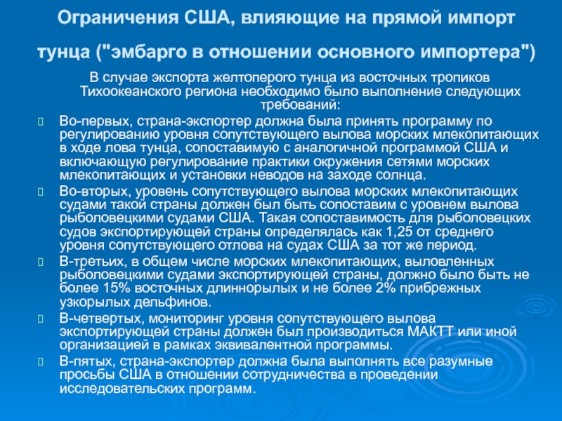 Слайд 7Ограничения США, влияющие на прямой импорт тунца ("эмбарго в отношении