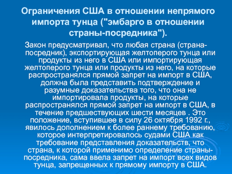 Слайд 10Ограничения США в отношении непрямого импорта тунца ("эмбарго в отношении