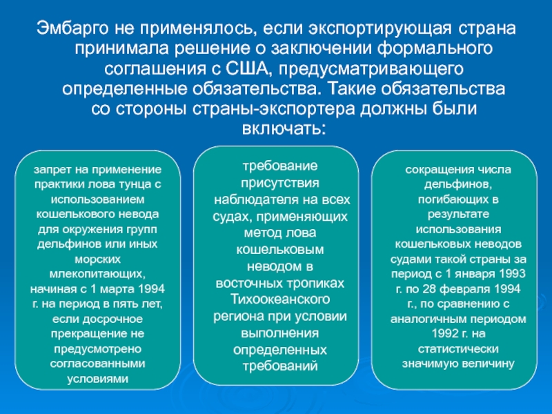 Во-первых, страна-экспортер должна была принять программу по регулированию уровня сопутствующего вылова морских млекопитающих в ходе лова тунца, сопоставимую с аналогичной программой США и включающую регулирование практики окружения сетями морских млекопитающих и установки неводов на заходе солнца.