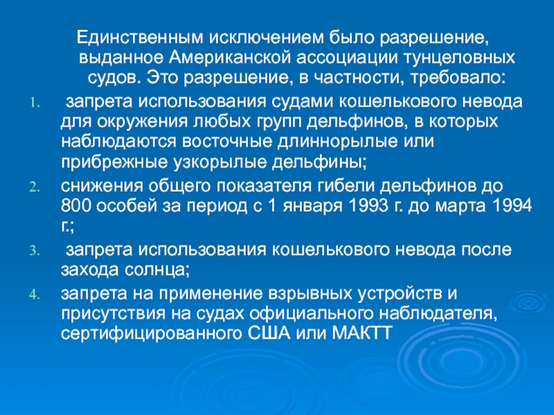 Слайд 5Единственным исключением было разрешение, выданное Американской ассоциации тунцеловных судов. Это