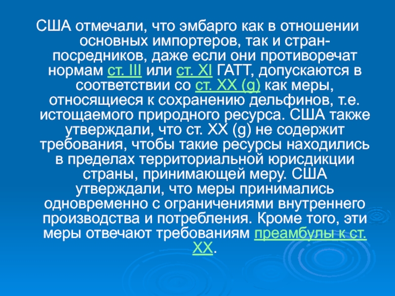 ст. XI ГАТТ, допускаются в соответствии со ст. XX (g) как меры, относящиеся к сохранению дельфинов, т.е. истощаемого природного ресурса. США также утверждали, что ст. XX (g) не содержит требования, чтобы такие ресурсы находились в пределах территориальной юрисдикции страны, принимающей меру. США утверждали, что меры принимались одновременно с ограничениями внутреннего производства и потребления. Кроме того, эти меры отвечают требованиям преамбулы к ст. XX.