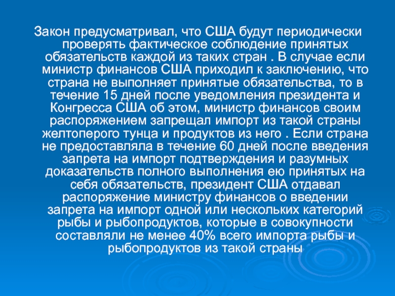 финансов США приходил к заключению, что страна не выполняет принятые обязательства, то в течение 15 дней после уведомления президента и Конгресса США об этом, министр финансов своим распоряжением запрещал импорт из такой страны желтоперого тунца и продуктов из него . Если страна не предоставляла в течение 60 дней после введения запрета на импорт подтверждения и разумных доказательств полного выполнения ею принятых на себя обязательств, президент США отдавал распоряжение министру финансов о введении запрета на импорт одной или нескольких категорий рыбы и рыбопродуктов, которые в совокупности составляли не менее 40% всего импорта рыбы и рыбопродуктов из такой страны