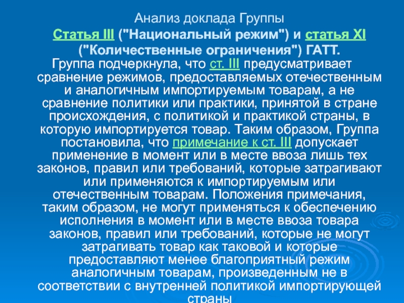 отечественным и аналогичным импортируемым товарам, а не сравнение политики или практики, принятой в стране происхождения, с политикой и практикой страны, в которую импортируется товар. Таким образом, Группа постановила, что примечание к ст. III допускает применение в момент или в месте ввоза лишь тех законов, правил или требований, которые затрагивают или применяются к импортируемым или отечественным товарам. Положения примечания, таким образом, не могут применяться к обеспечению исполнения в момент или в месте ввоза товара законов, правил или требований, которые не могут затрагивать товар как таковой и которые предоставляют менее благоприятный режим аналогичным товарам, произведенным не в соответствии с внутренней политикой импортирующей страны