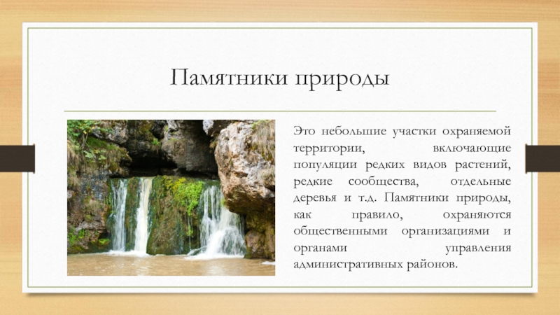 Памятники природыЭто небольшие участки охраняемой территории, включающие популяции редких видов растений, редкие сообщества, отдельные деревья и т.д.