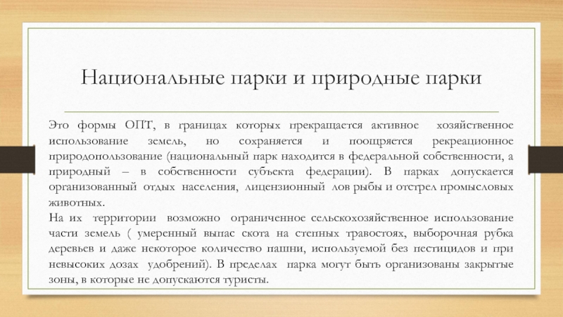 Национальные парки и природные паркиЭто формы ОПТ, в границах которых прекращается активное хозяйственное использование земель, но сохраняется