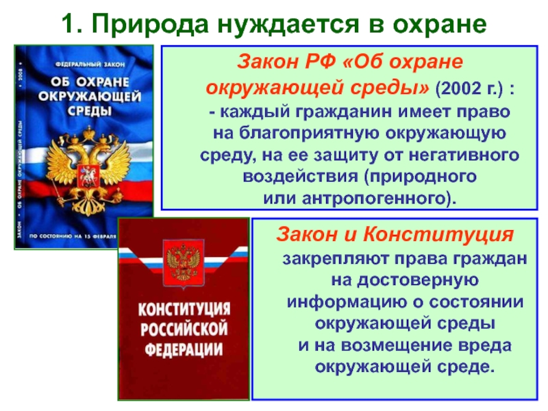 Закон и Конституция закрепляют права граждан на достоверную информацию о состоянии окружающей среды и на возмещение вреда окружающей среде.
