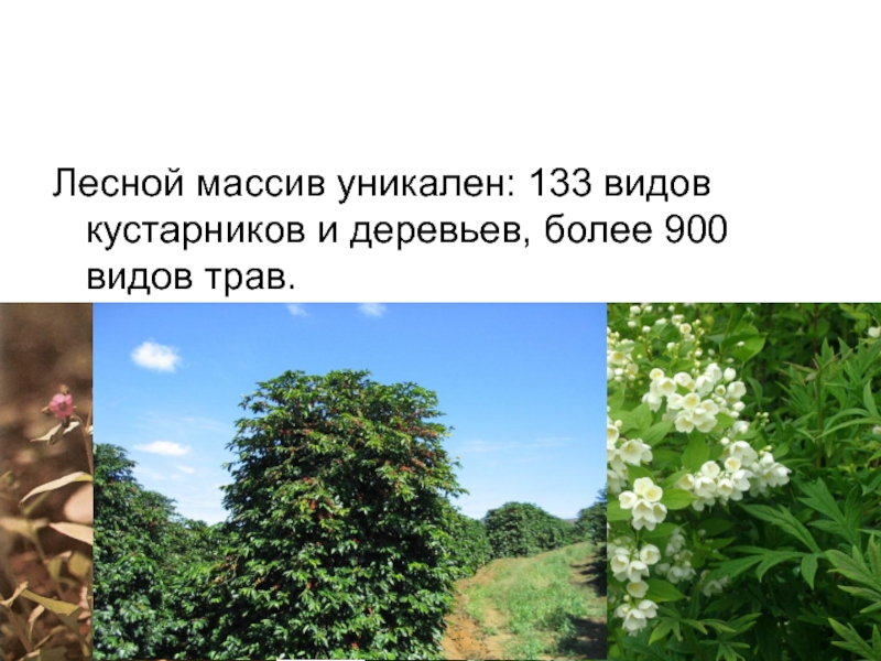 Слайд 23Лесной массив уникален: 133 видов кустарников и деревьев, более 900