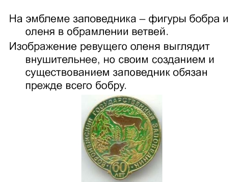 Слайд 19На эмблеме заповедника – фигуры бобра и оленя в обрамлении