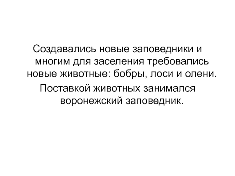 Слайд 26Создавались новые заповедники и многим для заселения требовались новые животные: