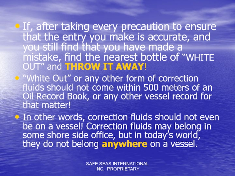 In other words, correction fluids should not even be on a vessel! Correction fluids may belong in some shore side office, but in today’s world, they do not belong anywhere on a vessel.