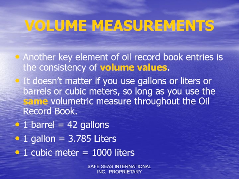 matter if you use gallons or liters or barrels or cubic meters, so long as you use the same volumetric measure throughout the Oil Record Book.