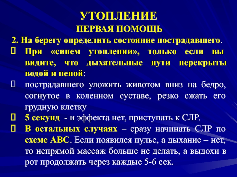 1. Искусственное дыхание начинать уже на воде. Периодически вдувать воздух в рот или в нос пострадавшего во время его транспортировки к берегу или к лодке.
