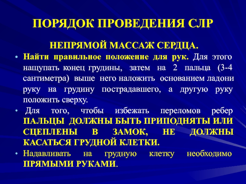 Для того, чтобы избежать переломов ребер ПАЛЬЦЫ ДОЛЖНЫ БЫТЬ ПРИПОДНЯТЫ ИЛИ СЦЕПЛЕНЫ В ЗАМОК, НЕ ДОЛЖНЫ КАСАТЬСЯ ГРУДНОЙ КЛЕТКИ.