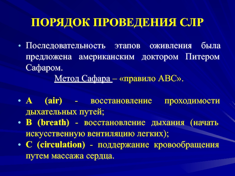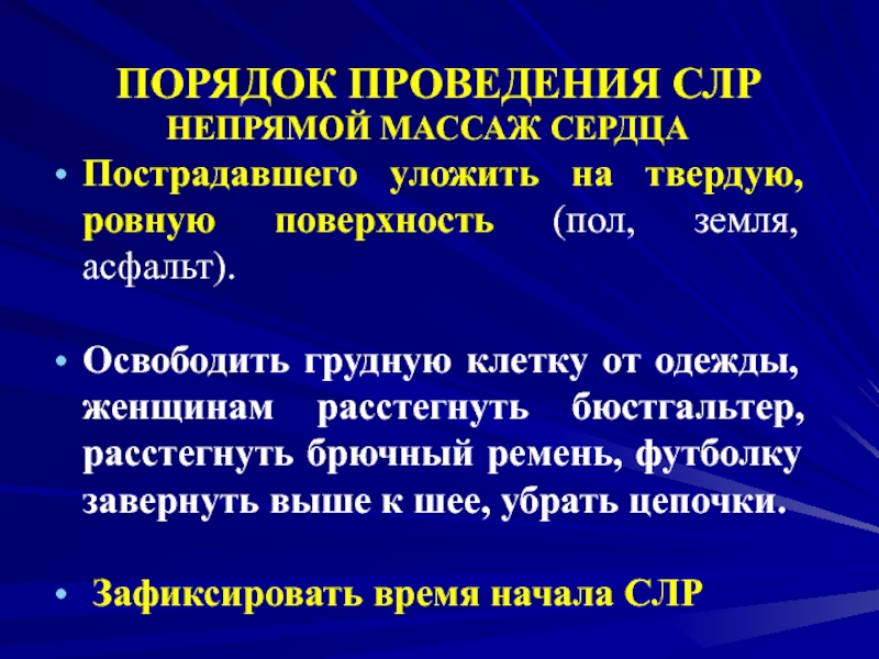 Слайд 2ПОРЯДОК ПРОВЕДЕНИЯ СЕРДЕЧНО-ЛЕГОЧНОЙ РЕАНИМАЦИИ (СЛР)