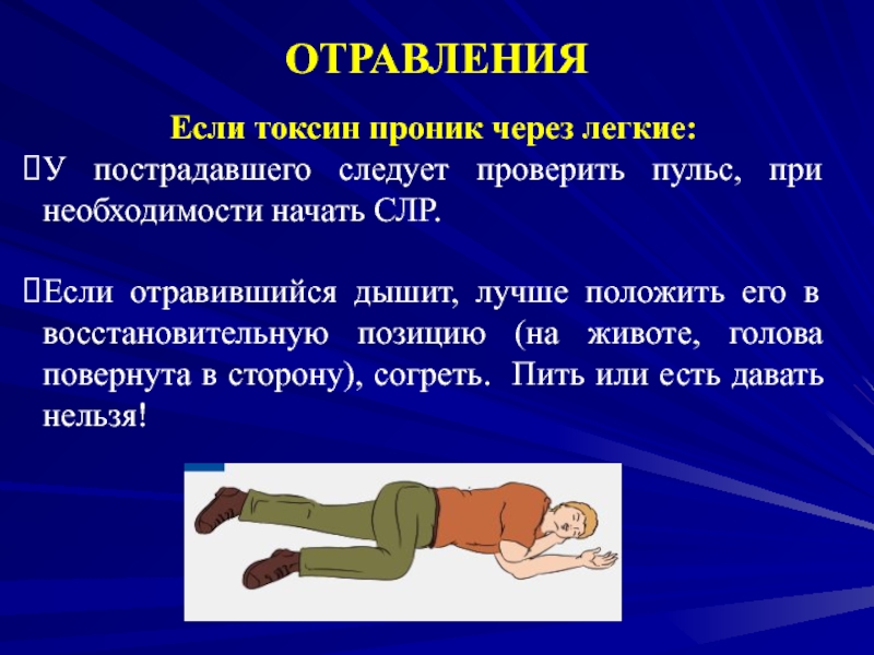 восстановительную позицию (на животе, голова повернута в сторону), согреть. Пить или есть давать нельзя!