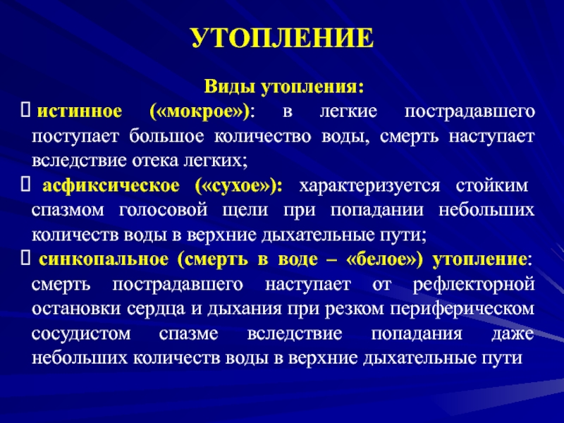 синкопальное (смерть в воде – «белое») утопление: смерть пострадавшего наступает от рефлекторной остановки сердца и дыхания при резком периферическом сосудистом спазме вследствие попадания даже небольших количеств воды в верхние дыхательные пути