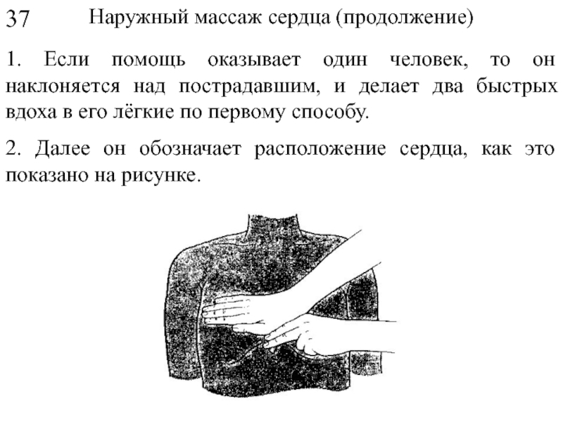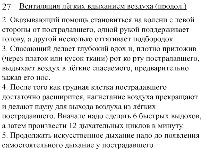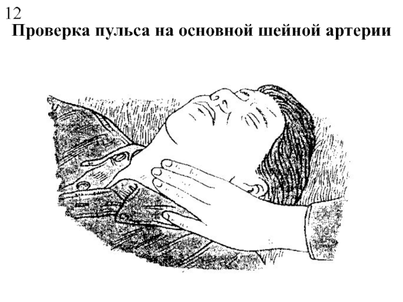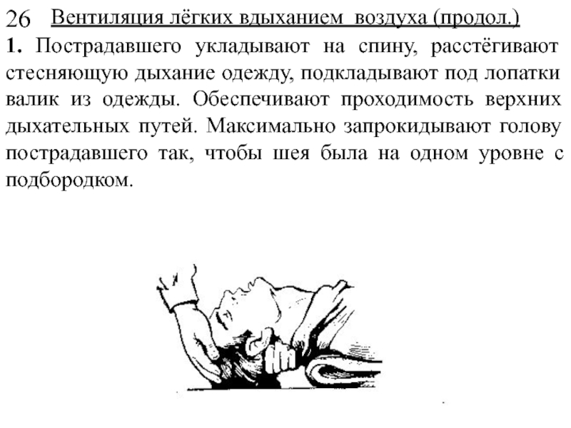 Если человек находится без сознания, то может произойти западания языка в глотку. Препятствовать дыханию могут также, попавшие туда куски пищи и предметы. Для освобождения дыхательных путей надо положить ладонь на затылок пострадавшему, а два пальца другой руки поместить под подбородок. Если требуется - вытянуть его язык, и дыхательные пути откроются, чтобы человек мог дышать (см. рисунок на следующем слайде).