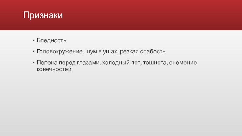 ПризнакиБледностьГоловокружение, шум в ушах, резкая слабость Пелена перед глазами, холодный пот, тошнота, онемение конечностей
