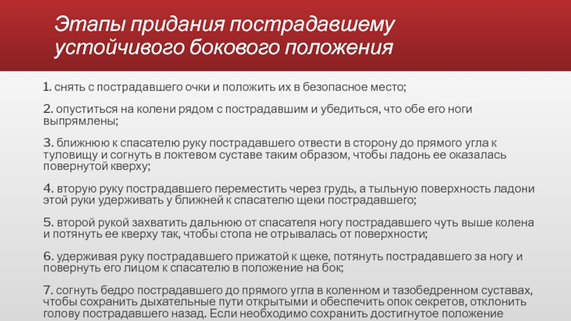 Этапы придания пострадавшему устойчивого бокового положения1. снять с пострадавшего очки и положить их в безопасное место;2. опуститься