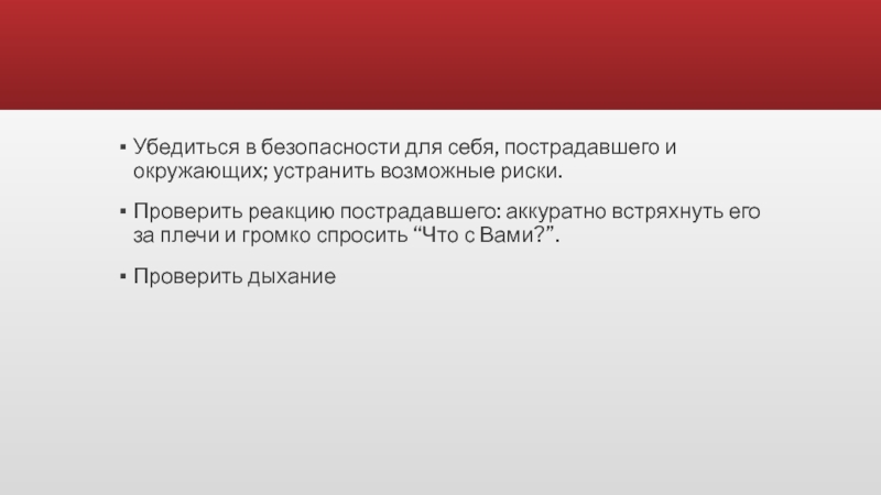 Слайд 2Убедиться в безопасности для себя, пострадавшего и окружающих; устранить возможные