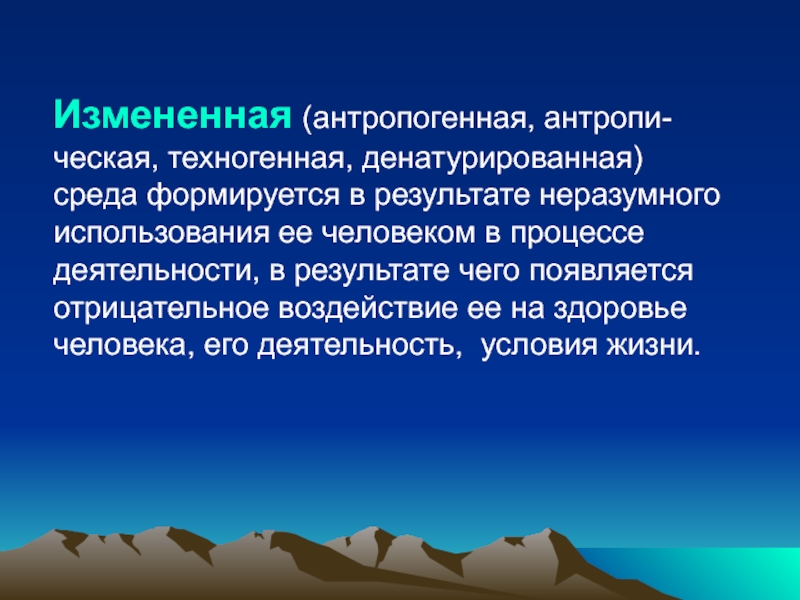 Слайд 6 Измененная (антропогенная, антропи-ческая, техногенная, денатурированная) среда формируется в