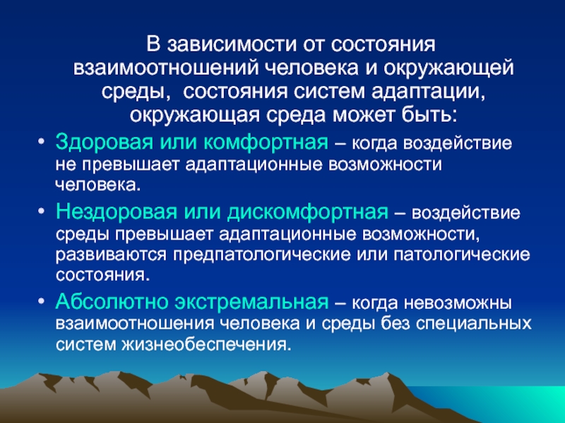 Нездоровая или дискомфортная – воздействие среды превышает адаптационные возможности, развиваются предпатологические или патологические состояния.