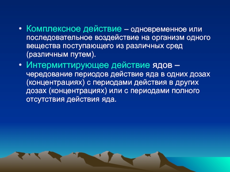 Слайд 13Комплексное действие – одновременное или последовательное воздействие на организм одного