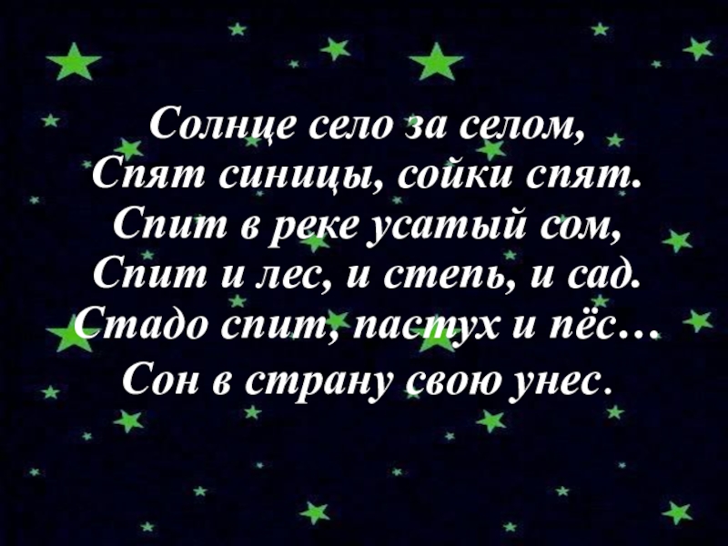 Солнце село за селом, Спят синицы, сойки спят. Спит в реке усатый сом, Спит и лес, и степь, и сад. Стадо спит, пастух и пёс… Сон в страну свою унес.