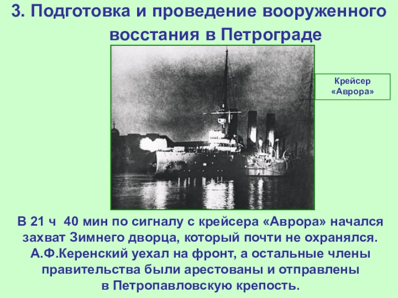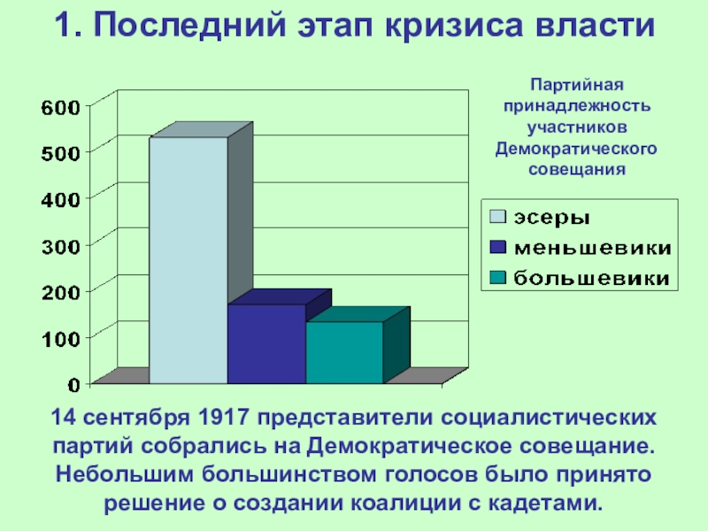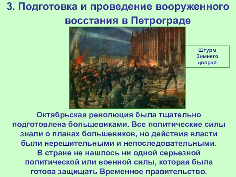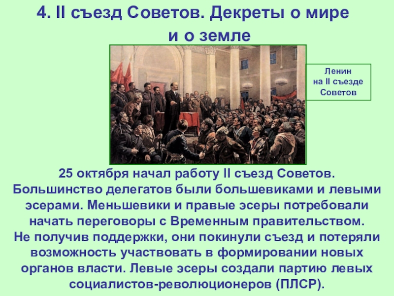 25 октября начал работу II съезд Советов. Большинство делегатов были большевиками и левыми эсерами. Меньшевики и правые эсеры потребовали начать переговоры с Временным правительством. Не получив поддержки, они покинули съезд и потеряли возможность участвовать в формировании новых органов власти. Левые эсеры создали партию левых социалистов-революционеров (ПЛСР).