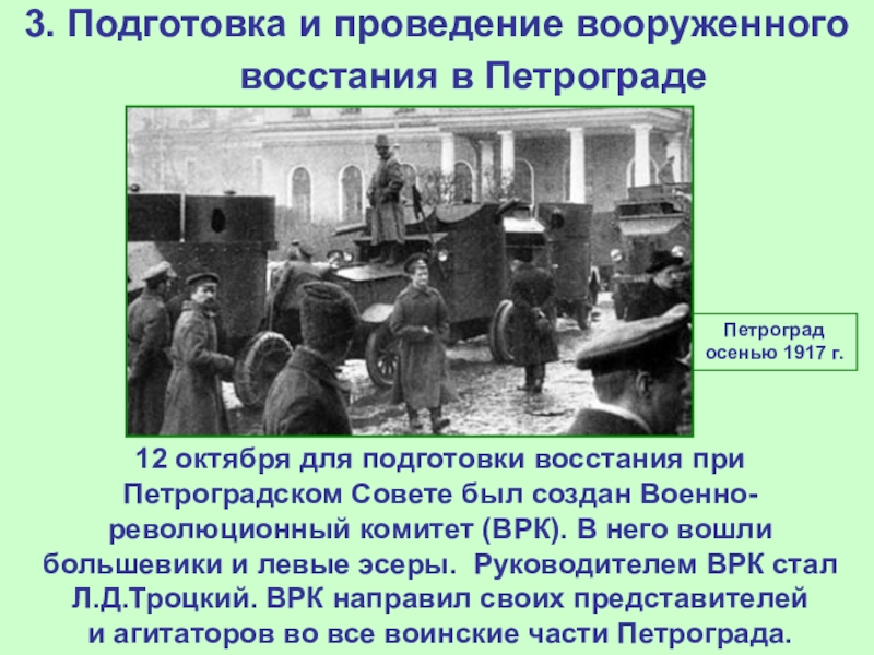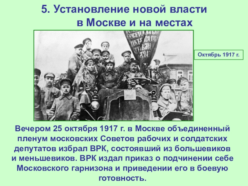 Вечером 25 октября 1917 г. в Москве объединенный пленум московских Советов рабочих и солдатских депутатов избрал ВРК, состоявший из большевиков и меньшевиков. ВРК издал приказ о подчинении себе Московского гарнизона и приведении его в боевую готовность.