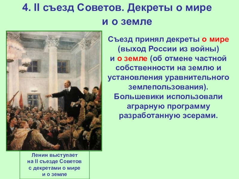 Съезд принял декреты о мире (выход России из войны) и о земле (об отмене частной собственности на землю и установления уравнительного землепользования). Большевики использовали аграрную программу разработанную эсерами.