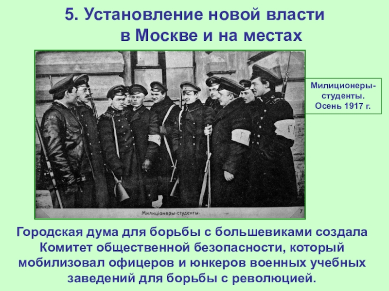 Городская дума для борьбы с большевиками создала Комитет общественной безопасности, который мобилизовал офицеров и юнкеров военных учебных заведений для борьбы с революцией.