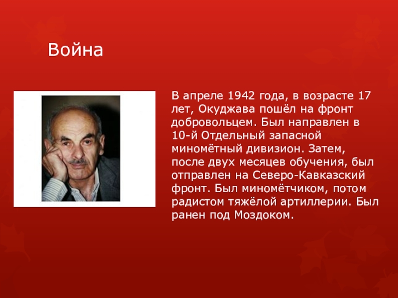 В апреле 1942 года, в возрасте 17 лет, Окуджава пошёл