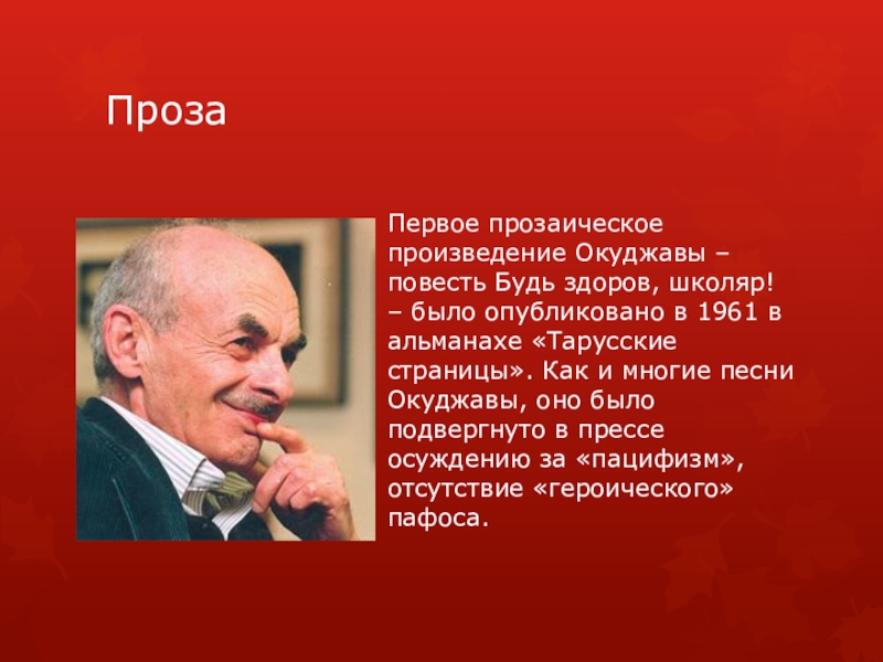 Первое прозаическое произведение Окуджавы – повесть Будь здоров, школяр! –
