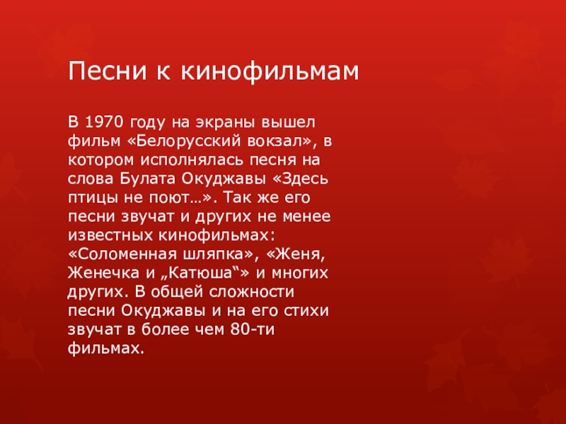 птицы не поют…». Так же его песни звучат и других не менее известных кинофильмах: «Соломенная шляпка», «Женя, Женечка и „Катюша“» и многих других. В общей сложности песни Окуджавы и на его стихи звучат в более чем 80-ти фильмах.