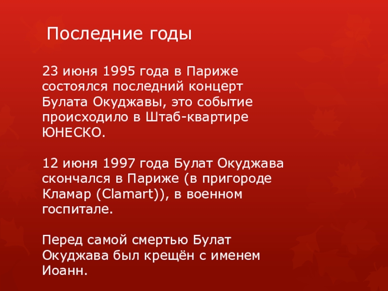 года Булат Окуджава скончался в Париже (в пригороде Кламар (Clamart)), в военном госпитале.