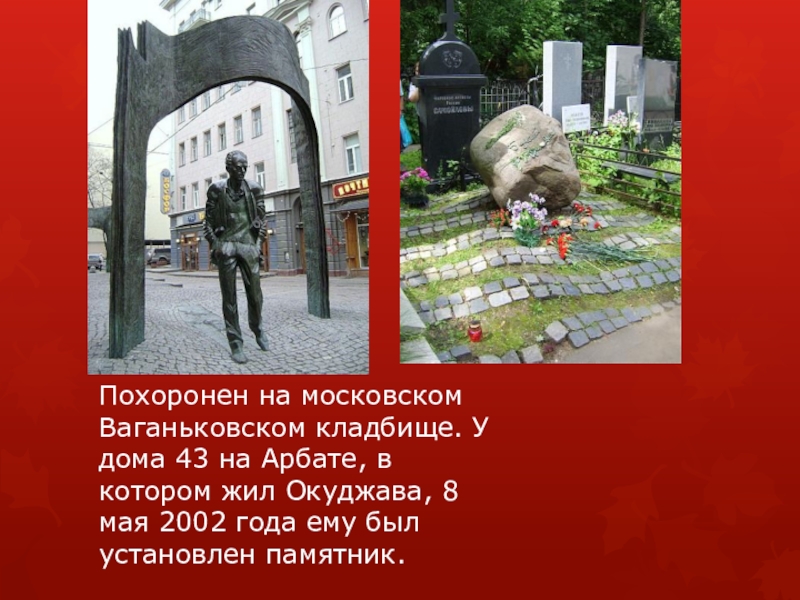 Слайд 9Похоронен на московском Ваганьковском кладбище. У дома 43 на Арбате,