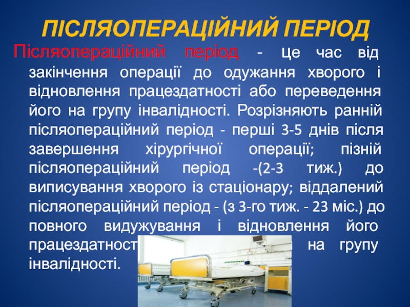інвалідності. Розрізняють ранній післяопераційний період - перші 3-5 днів після завершення хірургічної операції; пізній післяопераційний період -(2-3 тиж.) до виписування хворого із стаціонару; віддалений післяопераційний період - (з 3-го тиж. - 23 міс.) до повного видужування і відновлення його працездатності або переведення на групу інвалідності.